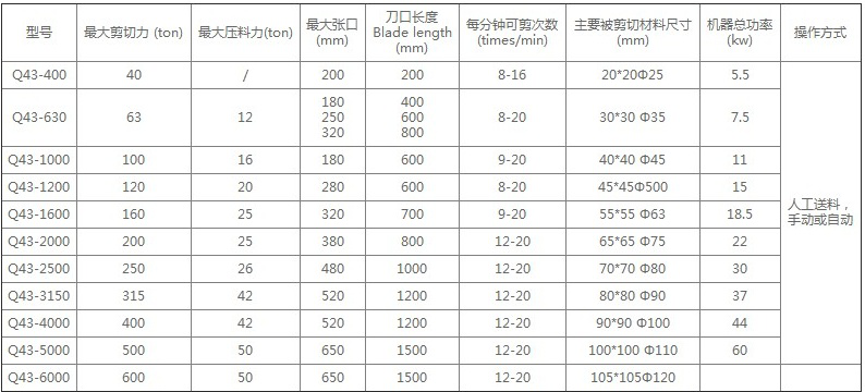 (2)工作刀口長度:400mm,600mm700mm800mm1000mm1200mm1500mmn,剪切力從63噸至6000噸共10個等級。700mm以上力口的剪切機,特別適用于剪切報廢汽車。